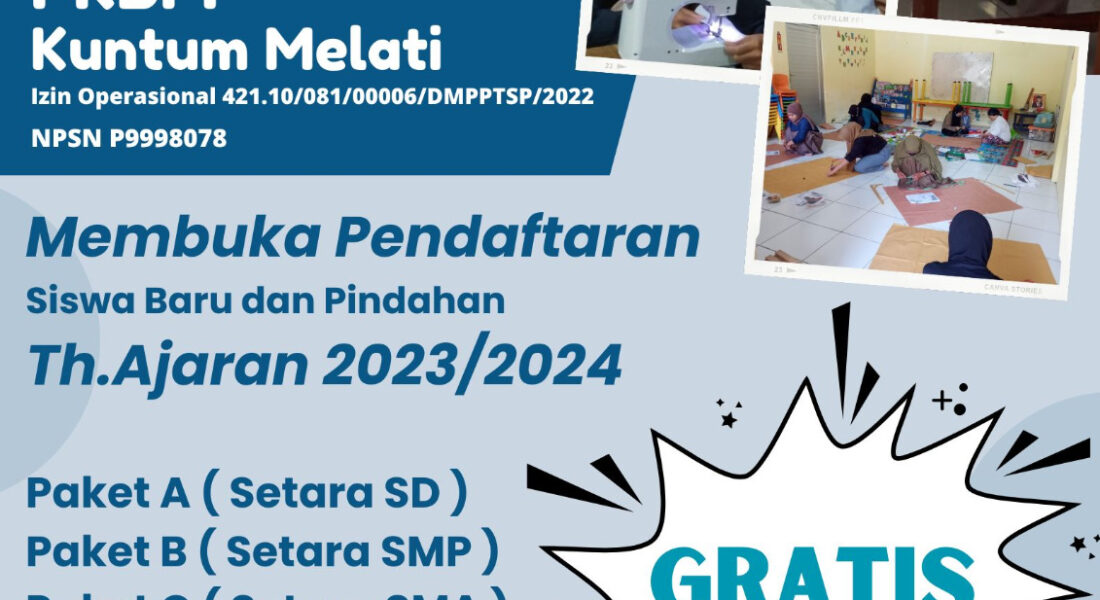 Dengan ini kami umumkan bahwa Penerimaan Peserta Didik Baru (PPDB) PKBM Kuntum Melati untuk Tahun Ajaran 2025-2026 resmi dibuka. PKBM Kuntum Melati kembali membuka kesempatan bagi putra-putri terbaik bangsa untuk melanjutkan pendidikan nonformal yang berkualitas dan terjangkau. Kami menawarkan program Paket A (setara SD), Paket B (setara SMP), dan Paket C (setara SMA) dengan kurikulum nasional dan tenaga pengajar yang berpengalaman.